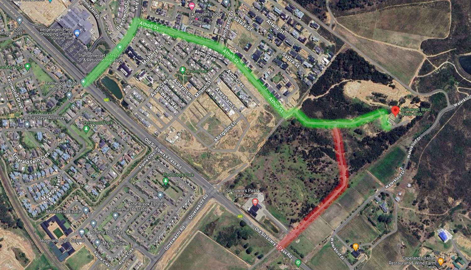 The Old Sir Lowry's Pass Rd entrance is permanently closed. Use the main entrance at the end of Atholl Street between Fairhaven Country Estate and The Somerset Lifestyle & Retirement Village.